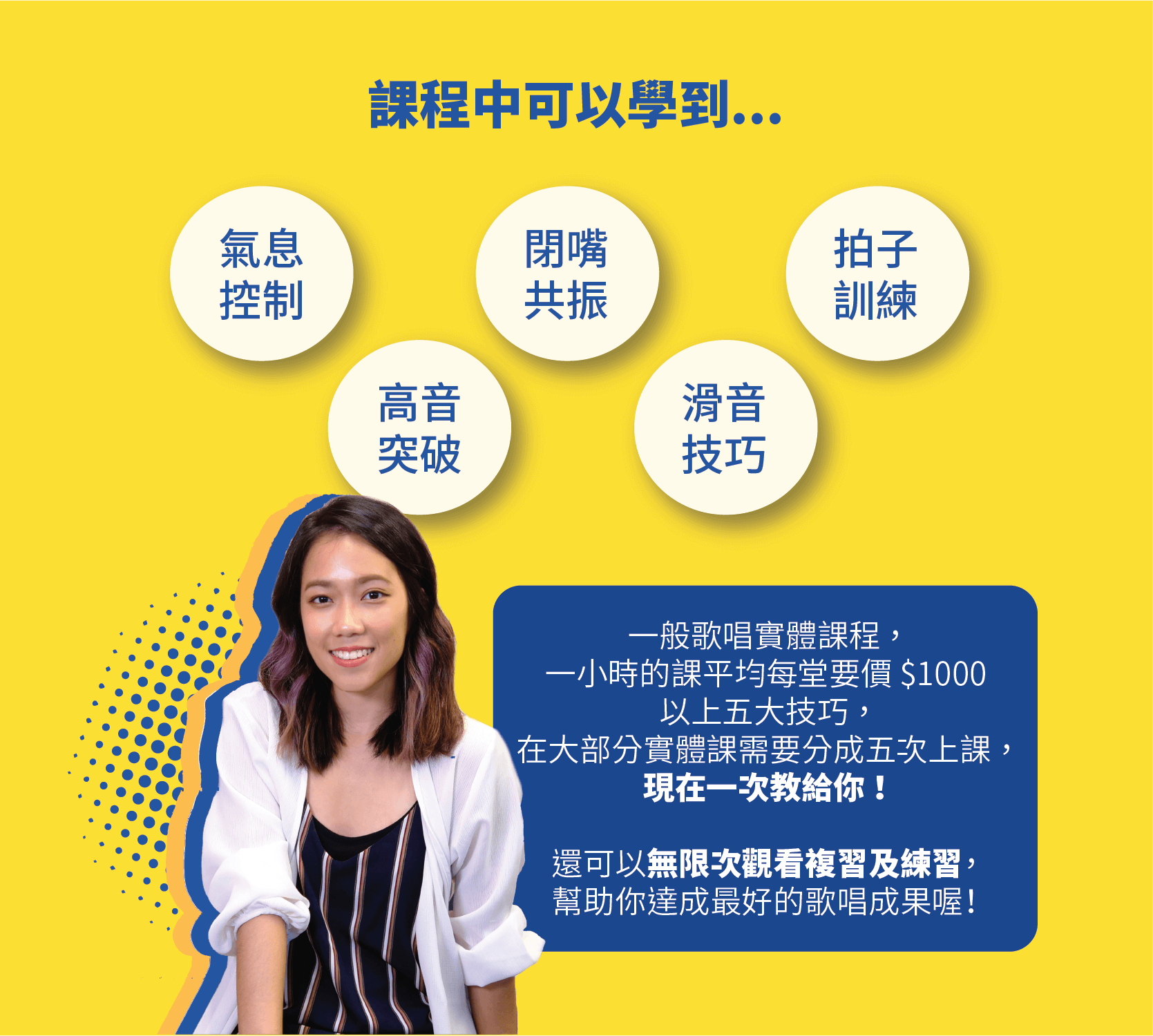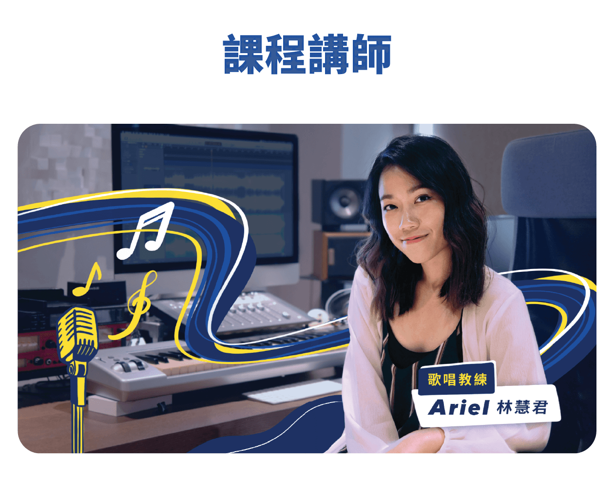 《Ariel老師|初階歌唱線上課程》濃縮了我音樂職涯累積的經驗與知識,不受樂理門檻限制,讓你輕鬆踏入歌唱世界!我將會以輕鬆好懂的方式「讓你在KTV唱歌更有自信,聲音變得更紮實渾厚」
