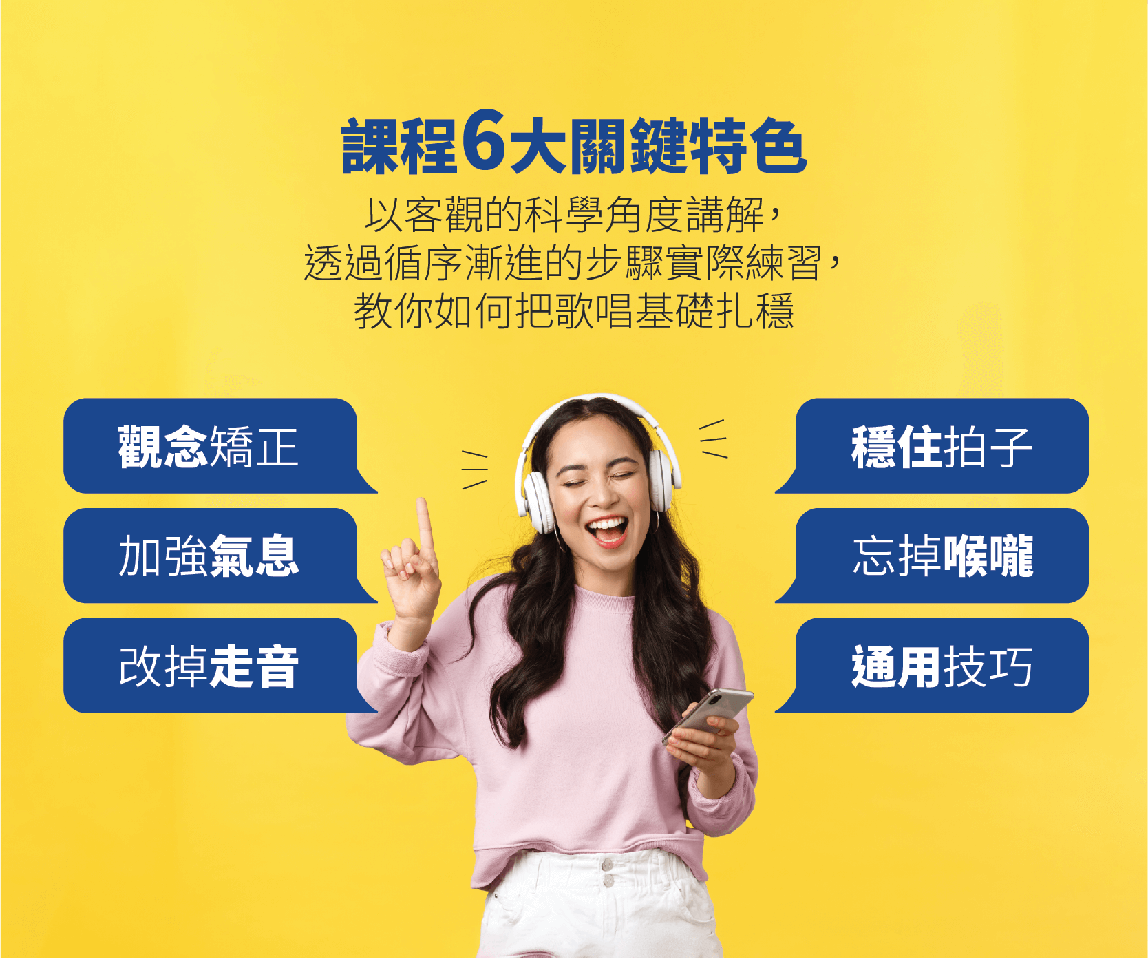 - 輕鬆唱高音練習四階段訓練:從簡單的生理特性發聲,再進階到唱音階及旋律,最後搭配腹式呼吸唱出更有穿透力的聲音